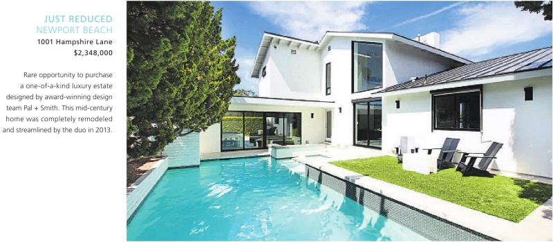 JUST REDUCED NEWPORT BEACH 1001 Hampshire Lane $2,348,000 Rare opportunity to purchase a one-of-a-kind luxury estate designed by award-winning design team Pal + Smith. This mid-century home was completely remodeled and streamlined by the duo in 2013.