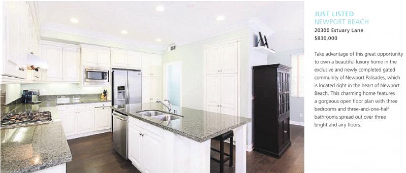 JUST LISTED NEWPORT BEACH 20300 Estuary Lane $830,000 Take advantage of this great opportunity to own a beautiful luxury home in the exclusive and newly completed gated community of Newport Palisades, which is located right in the heart of Newport Beach. This charming home features a gorgeous open floor plan with three bedrooms and three-and-one-half bathrooms spread out over three bright and airy floors. See also