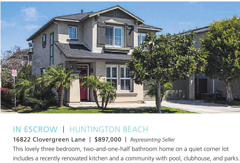 IN ESCROW | HUNTINGTON BEACH 16822 Clovergreen Lane | $897,000 | Representing Seller This lovely three bedroom, two-and-one-half bathroom home on a quiet corner lot includes a recently renovated kitchen and a community with pool, clubhouse, and parks. See also