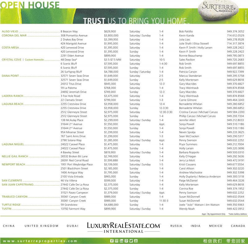 ALISO VIEJO ...................................................... 8 Beacon Way $629,900 Saturday 1-4 Bob Pattillo 949.374.3052 CORONA DEL MAR ........................................... 308 Poinsettia Avenue $3,800,000 Saturday | Sunday 1-4 Kevin Kanda 714.612.0529 2 Drakes Bay Drive $3,399,950 Saturday 1-4 Julia Liao 949.278.9528 424 Marigold Avenue $1,995,000 Saturday 1-4 Julie Shafii | Eliisa Stowell 714.317.3874 COSTA MESA..................................................... 420 Lenwood Drive $1,395,000 Saturday 1-4 Kevin P. Smith | Holly Larsen 949.228.2422 420 Lenwood Drive $1,395,000 Sunday 1-4 Kevin P. Smith 949.228.2422 2291 Elden Avenue $899,900 Saturday 1-4 Ronnie Beauchamp 949.795.0873 CRYSTAL COVE | CustomHomesite..................... 48 Deep Sea* $3.5-$7.5 MM Saturday 10-5 Sales Pavilion 949.720.2683 6 Scenic Bluff $7,595,000 Saturday 1-4:30 Rob Smith 949.697.8855 6 Scenic Bluff $7,595,000 Sunday 1-4 Rob Smith 949.697.8855 26 Surfspray Bluff $4,788,000 Sunday | Saturday 1-4 Patricia Carson 949.922.7399 DANA POINT ..................................................... 32571 Seven Seas Drive $1,649,000 Saturday 2-5 Marcus Skenderian 949.295.5758 32571 Seven Seas Drive $1,649,000 Sunday 2-5 Kelly Mortensen 949.629.8618 24312 Titus Drive $945,000 Saturday 12-3 Gary Macrides 949.370.6827 59 La Paloma $768,000 Saturday 1-4 Tracy Weintraub 949.874.8568 24692 Jeremiah Drive $749,000 Sunday 12-3 Gary Macrides 949.370.6827 LADERA RANCH................................................ 3 Fox Hole Road $3,475,000 Saturday 1-4 Tracy Weintraub 949.874.8568 22 Clematis Street $799,000 Saturday 1-3 Carrie Gilmore 949.464.3243 LAGUNA BEACH................................................ 2255 Crestview Drive $3,958,000 Saturday 12-4 Bernadette Whelan 949.280.6852 2255 Crestview Drive $3,958,000 Sunday 12-3:30 Bernadette Whelan 949.280.6852 2512 Glenneyre Street $2,975,000 Saturday 12:30-3:30 Cristina Caruso | Michael Caruso 949.584.2200 2512 Glenneyre Street $2,975,000 Sunday 1-4 Phillip Caruso | Michael Caruso 949.293.7334 138 McAulay Place $2,299,000 Saturday | Sunday 1-4 Jennifer Allert 949.212.8033 31644 2 nd Avenue $1,550,000 Saturday Appt. Sonja Powell 949.510.1186 31644 2 nd Avenue $1,550,000 Sunday 1-4 Sonja Powell 949.510.1186 954 Miramar Street $1,299,000 Saturday 1-4 Neven Spralja 949.233.3625 767 Saint Anns Drive $1,299,000 Saturday 1-3 Sean McCracken 949.290.5317 2790 Solana Way $1,285,000 Saturday | Sunday Appt. Penny Svenson 949.632.2252 LAGUNA NIGUEL............................................... 24022 Caravel Place $1,475,000 Saturday 1-4 Pryor Summers 949.212.7004 24022 Caravel Place $1,475,000 Sunday 1-4 Holly Larsen 949.220.3696 4 Bawley Street $819,900 Saturday | Sunday 1-4 Barbara Roppolo 949.500.0310 NELLIE GAIL RANCH ......................................... 26532 Broken Bit Lane $2,749,000 Saturday 1-4 Kelly O’Hagan 949.292.5636 26091 Red Corral Road $1,599,888 Saturday 1-4 Jerry La Mott 949.472.9191 NEWPORT BEACH ............................................. 1951 Port Weybridge Place $3,139,000 Saturday | Sunday 1-5 Kristi Cousens 949.677.5554 2501 Blackthorn Street $2,185,000 Sunday 1-4 Carol Allison 949.302.0220 1406 Antigua Way $1,795,000 Saturday 1-4 Andrew Machoskie 949.302.5398 2100 Vista Entrada $965,000 Sunday 1-4 Holly Duplanty | Rebecca Anderson 949.300.5118 SAN CLEMENTE................................................. 46 Via Villena $599,000 Saturday 1-4 Paige McDaniel 949.464.3226 SAN JUAN CAPISTRANO................................... 27442 Calle De La Rosa $2,375,000 Saturday 1-4 Kelly Mortensen 949.629.8618 27442 Calle De La Rosa $2,375,000 Sunday 1-4 Corrina Roe 949.374.1952 31521 Paseo Campeon $1,379,000 Saturday | Sunday Appt. Penny Svenson 949.632.2252 TRABUCO CANYON.......................................... 30061 Canyon Creek $989,000 Saturday 1-4 Susan McDonnell 949.632.0544 30061 Canyon Creek $989,000 Sunday 11:30-3 Susan McDonnell 949.632.0544 TURTLE RIDGE................................................... 59 Grandview $4,688,000 Sunday 1-4 Joele “JoJo” Watson | Jim Watson 949.350.9363 TUSTIN ............................................................... 13792 Fairmont Way $899,900 Saturday | Sunday 1-4 Wendy Noah 949.422.0912 Appt. | By AppointmentOnly *SalesGallery Address