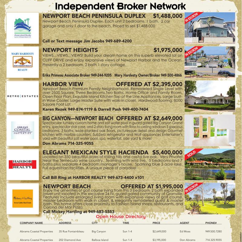 Abrams Coastal Properties 202 Diamond Ave Balboa Island Sun 1-4 $3,195,000 Don Abrams 714.325.9055