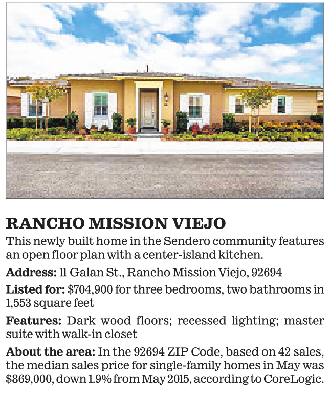 About the area: In the 92694 ZIP Code, based on 42 sales, the median sales price for single-family homes in May was $869,000, down1.9% from May 2015, according to CoreLogic.