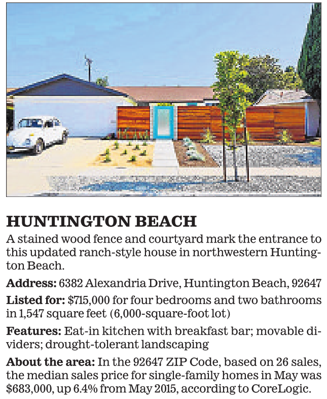 HUNTINGTON BEACH Astained wood fence and courtyard mark the entrance to this updated ranch-style house in northwestern Huntington Beach. Address: 6382 Alexandria Drive, Huntington Beach, 92647 Listed for: $715,000 for four bedrooms and two bathrooms in 1,547 square feet (6,000-square-foot lot) Features: Eat-in kitchen with breakfast bar; movable dividers; drought-tolerant landscaping About the area: In the 92647 ZIP Code, based on 26 sales, the median sales price for single-family homes in May was $683,000, up 6.4% from May 2015, according to CoreLogic.