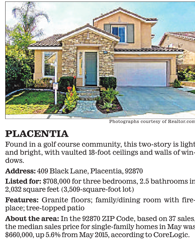 Photographs courtesy of Realtor.com PLACENTIA Found in a golf course community, this two-story is light and bright, with vaulted 18-foot ceilings and walls of windows. Address: 409 Black Lane, Placentia, 92870 Listed for: $708,000 for three bedrooms, 2.5 bathrooms in 2,032 square feet (3,509-square-foot lot) Features: Granite floors; family/dining room with fireplace; tree-topped patio About the area: In the 92870 ZIP Code, based on 37 sales, the median sales price for single-family homes in May was $660,000, up 5.6% from May 2015, according to CoreLogic.