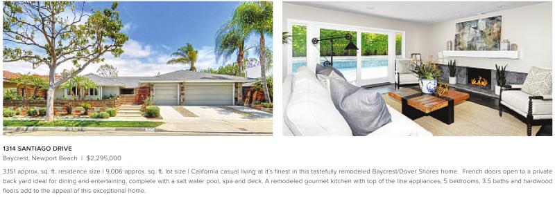 1314 SANTIAGO DRIVE Baycrest, Newport Beach | $2,295,000 3,151 approx. sq. ft. residence size | 9,006 approx. sq. ft. lot size | California casual living at it’s finest in this tastefully remodeled Baycrest/Dover Shores home. French doors open to a private back yard ideal for dining and entertaining, complete with a salt water pool, spa and deck. A remodeled gourmet kitchen with top of the line appliances, 5 bedrooms, 3.5 baths and hardwood floors add to the appeal of this exceptional home.