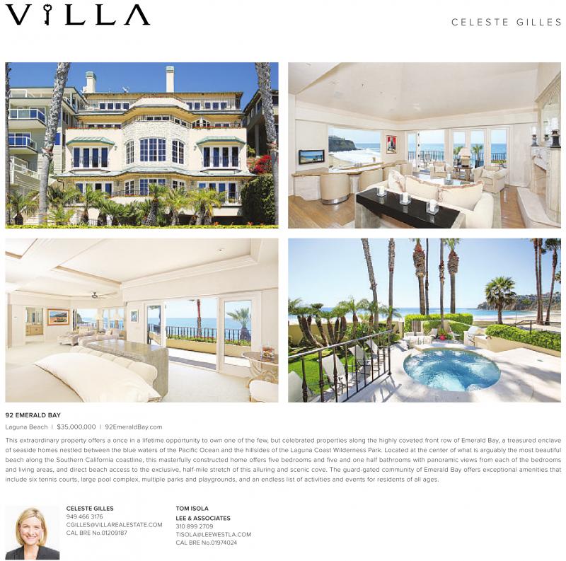 C E L E S T E G I L L E S 92 EMERALD BAY Laguna Beach | $35,000,000 | 92EmeraldBay.com This extraordinary property offers a once in a lifetime opportunity to own one of the few, but celebrated properties along the highly coveted front row of Emerald Bay, a treasured enclave of seaside homes nestled between the blue waters of the Pacific Ocean and the hillsides of the Laguna Coast Wilderness Park. Located at the center of what is arguably the most beautiful beach along the Southern California coastline, this masterfully constructed home offers five bedrooms and five and one half bathrooms with panoramic views from each of the bedrooms and living areas, and direct beach access to the exclusive, half-mile stretch of this alluring and scenic cove. The guard-gated community of Emerald Bay offers exceptional amenities that include six tennis courts, large pool complex, multiple parks and playgrounds, and an endless list of activities and events for residents of all ages. CELESTE GILLES 949 466 3176 CGILLES@VILLAREALESTATE.COM CAL BRE No.01209187 TOM ISOLA LEE &ASSOCIATES 310 899 2709 TISOLA@LEEWESTLA.COM CAL BRE No.01974024