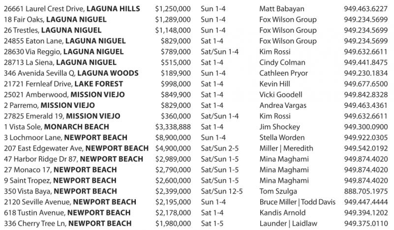 26661 Laurel Crest Drive, LAGUNA HILLS $1,250,000 Sun 1-4 Matt Babayan 949.463.6227 18 Fair Oaks, LAGUNA NIGUEL $1,289,000 Sun 1-4 FoxWilson Group 949.234.5699 26 Trestles, LAGUNA NIGUEL $1,148,000 Sun 1-4 FoxWilson Group 949.234.5699 24855 EatonLane, LAGUNA NIGUEL $829,000 Sat1-4 FoxWilson Group 949.234.5699 28630 ViaReggio, LAGUNA NIGUEL $789,000 Sat/Sun 1-4 KimRossi 949.632.6611 28713 La Siena, LAGUNA NIGUEL $515,000 Sat1-4 Cindy Colman 949.441.8475 346 AvenidaSevilla Q, LAGUNA WOODS $189,900 Sun 1-4 Cathleen Pryor 949.230.1834 21721 Fernleaf Drive, LAKE FOREST $998,000 Sat1-4 Kevin Hill 949.677.6500 25021 Amberwood, MISSION VIEJO $849,900 Sat1-4 VickiGoodell 949.842.8328 2Parremo, MISSION VIEJO $829,000 Sat1-4 AndreaVargas 949.463.4361 27825 Emerald 19, MISSION VIEJO $360,000 Sat/Sun 1-4 KimRossi 949.632.6611 1VistaSole, MONARCH BEACH $3,338,888 Sat1-4 Jim Shockey 949.300.0900 3Lochmoor Lane, NEWPORT BEACH $8,900,000 Sun 1-4 Stella Worden 949.922.0305 207 East Edgewater Ave, NEWPORT BEACH $4,900,000 Sat/Sun 2-5 Miller |Meredith 949.542.0192 47 Harbor Ridge Dr 87, NEWPORT BEACH $2,989,000 Sat/Sun 1-5 Mina Maghami 949.874.4020 27 Monaco17, NEWPORT BEACH $2,790,000 Sat/Sun 1-5 Mina Maghami 949.874.4020 9SaintTropez, NEWPORT BEACH $2,600,000 Sat/Sun 1-5 Mina Maghami 949.874.4020 350 Vista Baya, NEWPORT BEACH $2,399,000 Sat/Sun 12-5 TomSzulga 888.705.1975 2120 SevilleAvenue, NEWPORT BEACH $2,195,000 Sun 1-4 BruceMiller |ToddDavis 949.447.4444 618 Tustin Avenue, NEWPORT BEACH $2,178,000 Sat1-4 Kandis Arnold 949.394.1202 336 Cherry Tree Ln, NEWPORT BEACH $1,980,000 Sat1-5 Launder |Laidlaw 949.375.0110