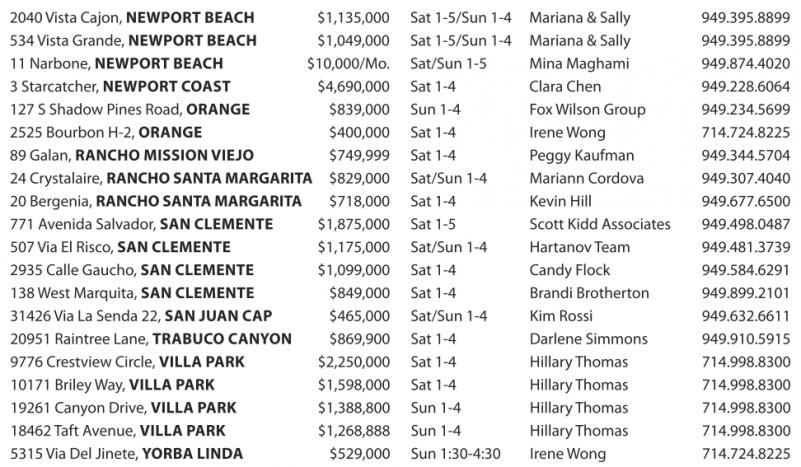 2040 Vista Cajon, NEWPORT BEACH $1,135,000 Sat1-5/Sun 1-4 Mariana &Sally 949.395.8899 534 Vista Grande, NEWPORT BEACH $1,049,000 Sat1-5/Sun 1-4 Mariana &Sally 949.395.8899 11 Narbone, NEWPORT BEACH $10,000/Mo. Sat/Sun 1-5 Mina Maghami 949.874.4020 3Starcatcher, NEWPORT COAST $4,690,000 Sat1-4 ClaraChen 949.228.6064 127 SShadowPines Road, ORANGE $839,000 Sun 1-4 FoxWilsonGroup 949.234.5699 2525 Bourbon H-2, ORANGE $400,000 Sat1-4 Irene Wong 714.724.8225 89 Galan, RANCHO MISSION VIEJO $749,999 Sat1-4 Peggy Kaufman 949.344.5704 24 Crystalaire, RANCHO SANTAMARGARITA $829,000 Sat/Sun 1-4 Mariann Cordova 949.307.4040 20 Bergenia, RANCHO SANTAMARGARITA $718,000 Sat1-4 Kevin Hill 949.677.6500 771 Avenida Salvador, SAN CLEMENTE $1,875,000 Sat1-5 Scott Kidd Associates 949.498.0487 507 ViaElRisco, SAN CLEMENTE $1,175,000 Sat/Sun 1-4 HartanovTeam 949.481.3739 2935 Calle Gaucho, SAN CLEMENTE $1,099,000 Sat1-4 Candy Flock 949.584.6291 138 West Marquita, SAN CLEMENTE $849,000 Sat1-4 Brandi Brotherton 949.899.2101 31426 ViaLaSenda 22, SAN JUAN CAP $465,000 Sat/Sun 1-4 KimRossi 949.632.6611 20951 Raintree Lane, TRABUCOCANYON $869,900 Sat1-4 Darlene Simmons 949.910.5915 9776 CrestviewCircle, VILLAPARK $2,250,000 Sat1-4 HillaryThomas 714.998.8300 10171 Briley Way, VILLAPARK $1,598,000 Sat 1-4 HillaryThomas 714.998.8300 19261 Canyon Drive, VILLAPARK $1,388,800 Sun 1-4 HillaryThomas 714.998.8300 18462 Taft Avenue, VILLAPARK $1,268,888 Sun 1-4 HillaryThomas 714.998.8300 5315 ViaDel Jinete, YORBALINDA $529,000 Sun 1:30-4:30 Irene Wong 714.724.8225