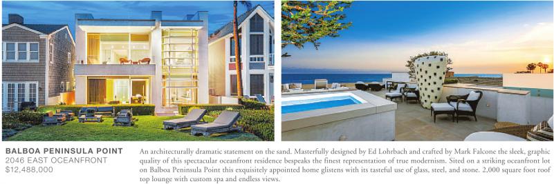 BALBOA PENINSULA POINT 2046 EAST OCEANFRONT $12,488,000 An architecturally dramatic statement on the sand. Masterfully designed by Ed Lohrbach and crafted by Mark Falcone the sleek, graphic quality of this spectacular oceanfront residence bespeaks the finest representation of true modernism. Sited on a striking oceanfront lot on Balboa Peninsula Point this exquisitely appointed home glistens with its tasteful use of glass, steel, and stone. 2,000 square foot roof top lounge with custom spa and endless views.