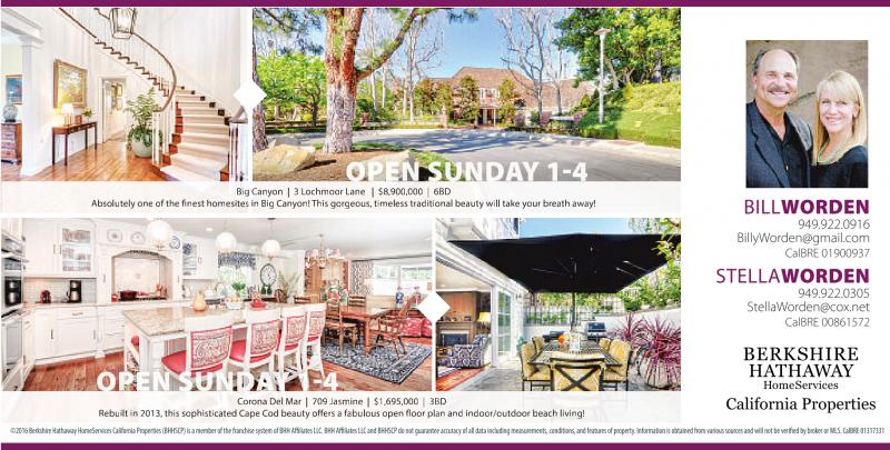 OPEN SUNDAY 1-4 Big Canyon | 3 Lochmoor Lane | $8,900,000 | 6BD Absolutely one of the finest homesites in Big Canyon! This gorgeous, timeless traditional beauty will take your breath away! BILLWORDEN 949.922.0916 BillyWorden@gmail.com CalBRE 01900937 STELLAWORDEN 949.922.0305 StellaWorden@cox.net CalBRE 00861572 OPEN SUNDAY 1-4 Corona Del Mar | 709 Jasmine | $1,695,000 | 3BD Rebuilt in 2013, this sophisticated Cape Cod beauty offers a fabulous open floor plan and indoor/outdoor beach living! ©2016 BerkshireHathaway HomeServices California Properties (BHHSCP)isamember of the franchise system of BHH AffiliatesLLC.BHH AffiliatesLLC andBHHSCP do not guaranteeaccuracyofall data including measurements,conditions,and features of property.Information is obtained from various sourcesand will not be verified by broker or MLS. CalBRE 01317331