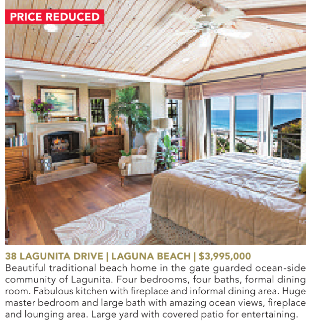 PRICE REDUCED 38 LAGUNITA DRIVE | LAGUNA BEACH | $3,995,000 Beautiful traditional beach home in the gate guarded ocean-side community of Lagunita. Four bedrooms, four baths, formal dining room.Fabulouskitchen with fireplaceand informal dining area.Huge master bedroom and large bath with amazing ocean views, fireplace and lounging area. Large yard with covered patio for entertaining.