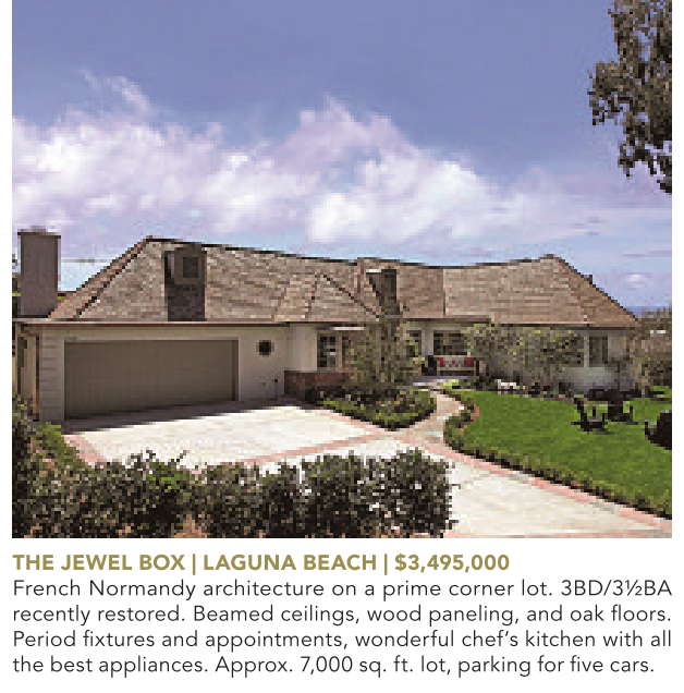 THE JEWEL BOX | LAGUNA BEACH | $3,495,000 French Normandy architecture on a prime corner lot. 3BD/3½BA recently restored. Beamed ceilings, wood paneling, and oak floors. Period fixtures and appointments, wonderful chef’s kitchen with all the best appliances. Approx. 7,000 sq. ft. lot, parking for five cars.