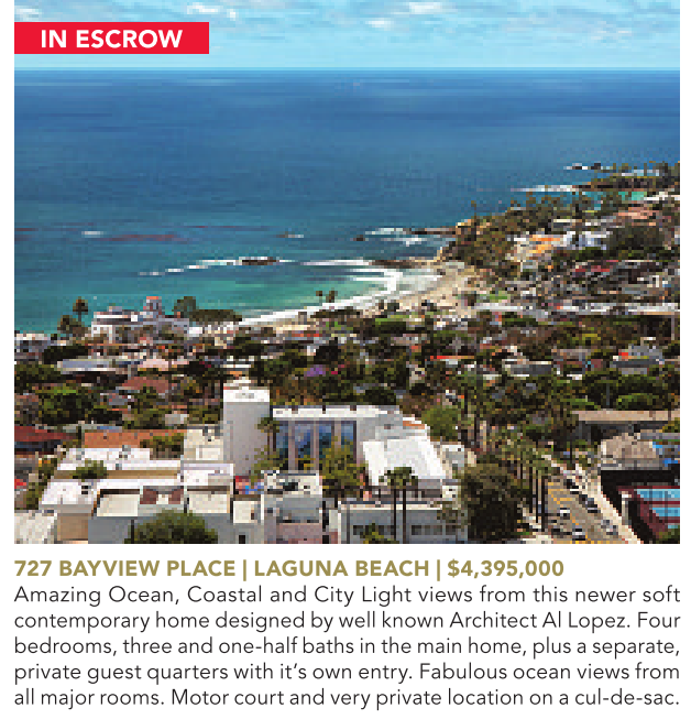 IN ESCROW 727 BAYVIEW PLACE | LAGUNA BEACH | $4,395,000 Amazing Ocean, Coastal and City Light views from this newer soft contemporaryhomedesigned by wellknownArchitect Al Lopez. Four bedrooms, threeand one-halfbaths in themainhome, plus aseparate, private guestquarters withit’s own entry. Fabulous ocean views from allmajor rooms. Motorcourt and very private location on acul-de-sac.