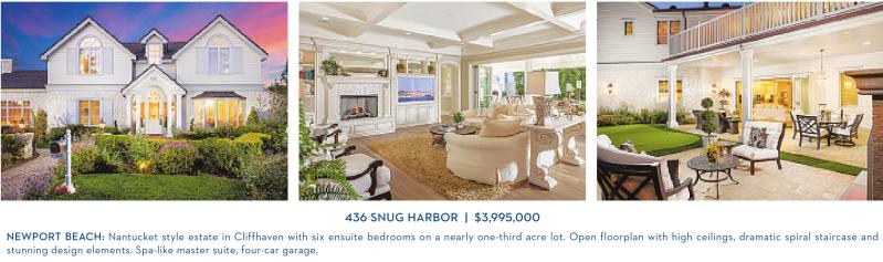 436 SNUG HARBOR | $3,995,000 NEWPORT BEACH: Nantucket style estate in Cliffhaven with six ensuite bedrooms on a nearly one-third acre lot. Open floorplan with high ceilings, dramatic spiral staircase and stunning design elements. Spa-like master suite, four-car garage.