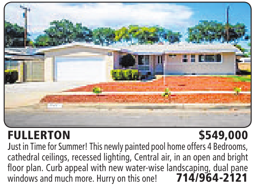 FULLERTON $549,000 Just in Time for Summer!Thisnewly paintedpoolhome offers4Bedrooms, cathedral ceilings, recessed lighting, Central air, inanopen and bright floor plan. Curb appeal with new water-wise landscaping, dual pane windowsand much more.Hurry on this one! 714/964-2121