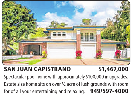 SAN JUAN CAPISTRANO $1,467,000 Spectacular poolhomewithapproximately $100,000 in upgrades. Estate size home sits on over½acreoflushgroundswithroom forofall your entertainingand relaxing. 949/597-4000