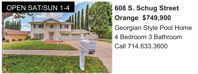 OPEN SAT/SUN 1-4 608 S. Schug Street Orange $749,900 Georgian Style Pool Home 4 Bedroom 3 Bathroom Call 714.633.3600