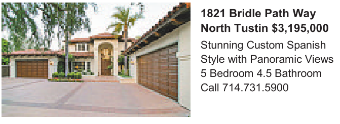 1821 Bridle Path Way North Tustin $3,195,000 Stunning Custom Spanish Style with Panoramic Views 5 Bedroom 4.5 Bathroom Call 714.731.5900