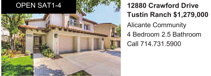 12880 Crawford Drive Tustin Ranch $1,279,000 Alicante Community 4 Bedroom 2.5 Bathroom Call 714.731.5900