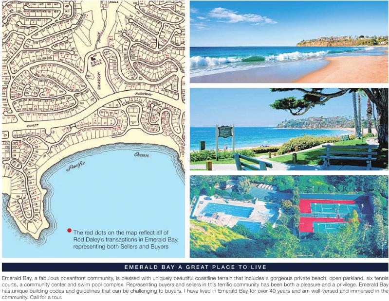 • •The red dots on the map reflect all of Rod Daley’s transactions in Emerald Bay, representing both Sellers and Buyers E M E R A L D B AY A G R E AT P L A C E T O L I V E Emerald Bay, a fabulous oceanfront community, is blessed with uniquely beautiful coastline terrain that includes a gorgeous private beach, open parkland, six tennis courts, a community center and swim pool complex. Representing buyers and sellers in this terrific community has been both a pleasure and a privilege. Emerald Bay has unique building codes and guidelines that can be challenging to buyers. I have lived in Emerald Bay for over 40 years and am well-versed and immersed in the community. Call for a tour.