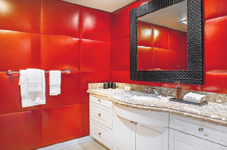 subdued hues are among details of note. Bathroom and kitchen countertops
