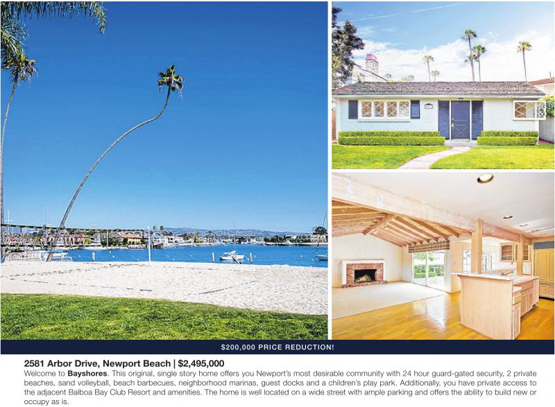 2581 Arbor Drive, Newport Beach | $2,495,000 Welcome to Bayshores. This original, single story home offers you Newport’s most desirable community with 24 hour guard-gated security, 2 private beaches, sand volleyball, beach barbecues, neighborhood marinas, guest docks and a children’s play park. Additionally, you have private access to the adjacent Balboa Bay Club Resort and amenities. The home is well located on a wide street with ample parking and offers the ability to build new or occupy as is.