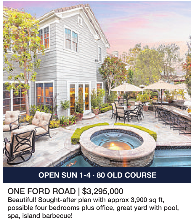 ONE FORD ROAD | $3,295,000 Beautiful! Sought-after plan with approx 3,900 sq ft, possible four bedrooms plus office, great yard with pool, spa, island barbecue!