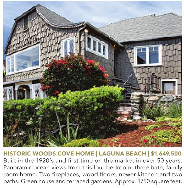 HISTORIC WOODS COVE HOME | LAGUNA BEACH | $1,649,500 Built in the 1920’s and first time on the market in over 50 years. Panoramic ocean views from this four bedroom, three bath, family room home. Two fireplaces, wood floors, newer kitchen and two baths. Green houseand terracedgardens. Approx.1750square feet.