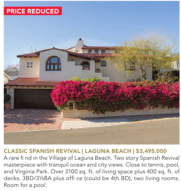 PRICE REDUCED CLASSIC SPANISH REVIVAL | LAGUNA BEACH | $3,495,000 Arare fi nd in theVillageofLagunaBeach. Twostory Spanish Revival masterpiecewithtranquil oceanand cityviews. Close to tennis,pool, and Virginia Park. Over 3100 sq. ft.ofliving space plus 400 sq. ft. of decks. 3BD/3½BA plus offi ce (could be 4th BD), two living rooms. Room for apool. See also