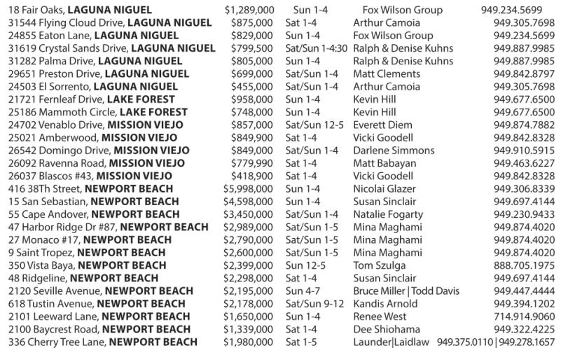 18 Fair Oaks, LAGUNA NIGUEL $1,289,000 Sun 1-4 FoxWilson Group 949.234.5699 31544 Flying Cloud Drive, LAGUNA NIGUEL $875,000 Sat1-4 Arthur Camoia 949.305.7698 24855 EatonLane, LAGUNA NIGUEL $829,000 Sun 1-4 FoxWilson Group 949.234.5699 31619 Crystal Sands Drive, LAGUNA NIGUEL $799,500 Sat/Sun 1-4:30 Ralph &Denise Kuhns 949.887.9985 31282 PalmaDrive, LAGUNA NIGUEL $805,000 Sun 1-4 Ralph &Denise Kuhns 949.887.9985 29651 Preston Drive, LAGUNA NIGUEL $699,000 Sat/Sun 1-4 Matt Clements 949.842.8797 24503 El Sorrento, LAGUNA NIGUEL $455,000 Sat/Sun 1-4 Arthur Camoia 949.305.7698 21721 Fernleaf Drive, LAKE FOREST $958,000 Sun 1-4 Kevin Hill 949.677.6500 25186 Mammoth Circle, LAKE FOREST $748,000 Sun 1-4 Kevin Hill 949.677.6500 24702 VenabloDrive, MISSION VIEJO $857,000 Sat/Sun 12-5 Everett Diem 949.874.7882 25021 Amberwood, MISSION VIEJO $849,900 Sat1-4 VickiGoodell 949.842.8328 26542 Domingo Drive, MISSION VIEJO $849,000 Sat/Sun 1-4 Darlene Simmons 949.910.5915 26092 Ravenna Road, MISSION VIEJO $779,990 Sat1-4 Matt Babayan 949.463.6227 26037 Blascos #43, MISSION VIEJO $418,900 Sat1-4 VickiGoodell 949.842.8328 416 38ThStreet, NEWPORT BEACH $5,998,000 Sun 1-4 Nicolai Glazer 949.306.8339 15 SanSebastian, NEWPORT BEACH $4,598,000 Sun 1-4 Susan Sinclair 949.697.4144 55 Cape Andover, NEWPORT BEACH $3,450,000 Sat/Sun 1-4 Natalie Fogarty 949.230.9433 47 Harbor Ridge Dr #87, NEWPORT BEACH $2,989,000 Sat/Sun 1-5 Mina Maghami 949.874.4020 27 Monaco#17, NEWPORT BEACH $2,790,000 Sat/Sun 1-5 Mina Maghami 949.874.4020 9SaintTropez, NEWPORT BEACH $2,600,000 Sat/Sun 1-5 Mina Maghami 949.874.4020 350 Vista Baya, NEWPORT BEACH $2,399,000 Sun 12-5 TomSzulga 888.705.1975 48 Ridgeline, NEWPORT BEACH $2,298,000 Sat1-4 Susan Sinclair 949.697.4144 2120 SevilleAvenue, NEWPORT BEACH $2,195,000 Sun 4-7 BruceMiller |ToddDavis 949.447.4444 618 Tustin Avenue, NEWPORT BEACH $2,178,000 Sat/Sun 9-12 Kandis Arnold 949.394.1202 2101 LeewardLane, NEWPORT BEACH $1,650,000 Sun 1-4 Renee West 714.914.9060 2100 Baycrest Road, NEWPORT BEACH $1,339,000 Sat1-4 DeeShiohama 949.322.4225 336 Cherry Tree Lane, NEWPORT BEACH $1,980,000 Sat 1-5 Launder|Laidlaw 949.375.0110 |949.278.1657