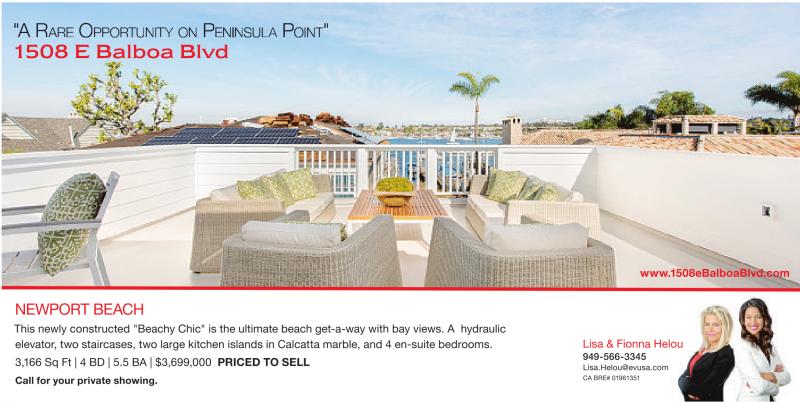 "A RARe OppORtunity ty On peninsulA pOint" 1508 E Balboa Blvd www.1508eBalboaBlvd.com NEWPORT BEACH This newly constructed "Beachy Chic" is the ultimate beach get-a-way with bay views. A hydraulic elevator, two staircases, two large kitchen islands in Calcatta marble, and 4 en-suite bedrooms. 3,166 Sq Ft | 4 BD | 5.5 BA | $3,699,000 PRICED TO SELL Call for your private showing. Lisa & Fionna Helou 949-566-3345 Lisa.Helou@evusa.com CA BRE# 01961351