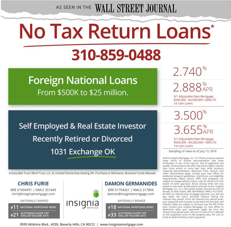 ©2016 Insignia Mortgage, Inc. *(1) These products require other forms of income documentation and asset verification in lieu of tax returns. Not all applicants will qualify. Some products we offer may have ahigher interest rate, more points or more fees than other products requiring documentation. Minimum FICO, reserve, and other requirements apply. Contact your loan officer for additional program guidelines, restrictions, and eligibility requirements. Rates, points, APRs and programs are subject to change without notice. Loan to values (LTV) are based on bank appraisal. Actual closing times will vary based on borrower qualifications and loan terms. Insignia Mortgage, Inc., is a real estate broker licensed by the CA Bureau of Real Estate, BRE #01969620, NMLS #1277691. (2) With an interest-only mortgage payment, you will not pay down the loan's principal balance during the interest-only period. Once the interest-only period ends, your payments will increase to pay back the principal and interest. Rates are subject to increase over the life of the loan. Contact your Insignia Mortgage, Inc. loan officer to determine what your payments might be once the interest-only period ends. (3) Loan to Cost (LTC) is defined as the acquisition price of the property plus the cost to build as determined by abank appraisal.