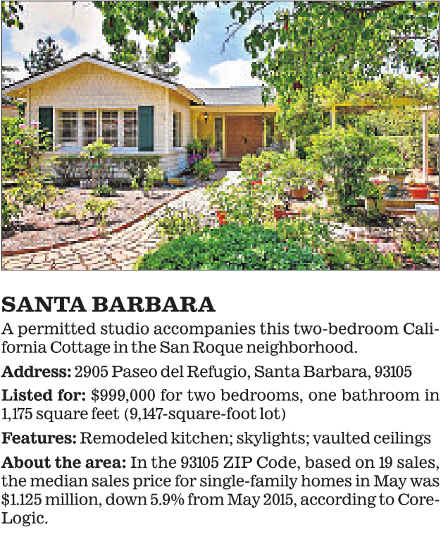 SANTA BARBARA Apermitted studio accompanies this two-bedroom California Cottage in the San Roque neighborhood. Address: 2905 Paseo del Refugio, Santa Barbara, 93105 Listed for: $999,000 for two bedrooms, one bathroom in 1,175 square feet (9,147-square-foot lot) Features: Remodeled kitchen; skylights; vaulted ceilings About the area: In the 93105 ZIP Code, based on 19 sales, the median sales price for single-family homes in May was $1.125 million, down 5.9% from May 2015, according to Core- Logic. See also