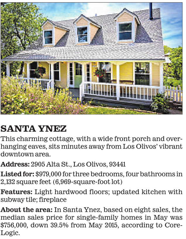 SANTA YNEZ This charming cottage, with a wide front porch and overhanging eaves, sits minutes away from Los Olivos’ vibrant downtown area. Address: 2905 Alta St., Los Olivos, 93441 Listed for: $979,000 for three bedrooms, four bathrooms in 2,132 square feet (6,969-square-foot lot) Features: Light hardwood floors; updated kitchen with subway tile; fireplace About the area: In Santa Ynez, based on eight sales, the median sales price for single-family homes in May was $756,000, down 39.5% from May 2015, according to Core- Logic.