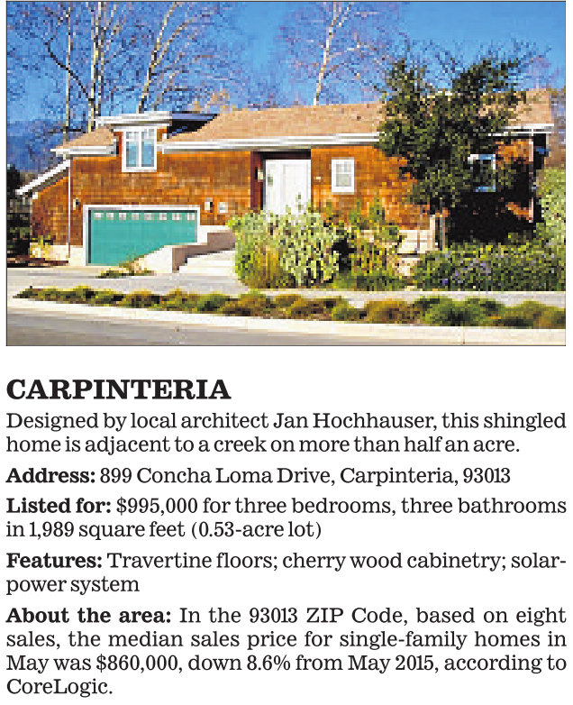 About the area: In the 93013 ZIP Code, based on eight sales, the median sales price for single-family homes in May was $860,000, down 8.6% from May 2015, according to CoreLogic.