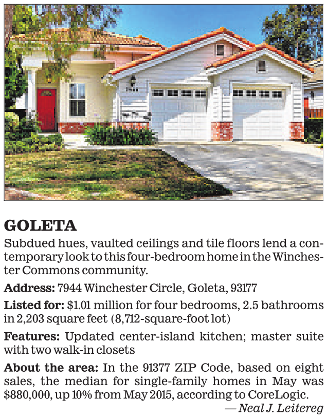 GOLETA Subdued hues, vaulted ceilings and tile floors lend a contemporarylook to this four-bedroom home in the Winchester Commons community. Address: 7944 Winchester Circle, Goleta, 93177 Listed for: $1.01 million for four bedrooms, 2.5 bathrooms in 2,203 square feet (8,712-square-foot lot) Features: Updated center-island kitchen; master suite with two walk-in closets About the area: In the 91377 ZIP Code, based on eight sales, the median for single-family homes in May was $880,000, up 10% from May 2015, according to CoreLogic. —Neal J. Leitereg