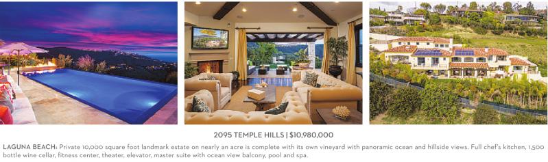 2095 TEMPLE HILLS | $10,980,000 LAGUNA BEACH: Private 10,000 square foot landmark estate on nearly an acre is complete with its own vineyard with panoramic ocean and hillside views. Full chef’s kitchen, 1,500 bottle wine cellar, fitness center, theater, elevator, master suite with ocean view balcony, pool and spa.