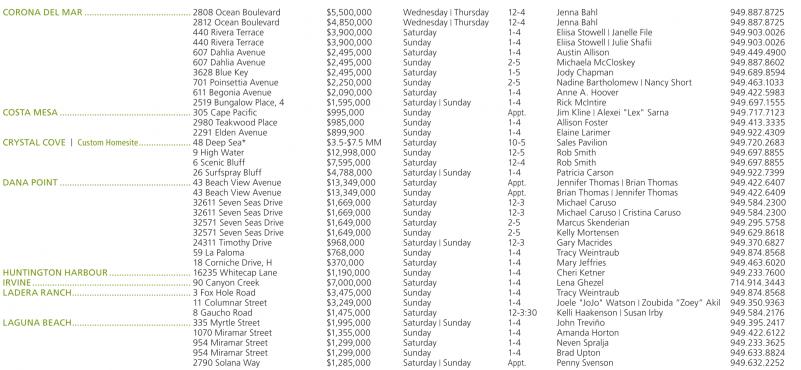 CORONA DEL MAR ........................................... 2808 Ocean Boulevard $5,500,000 Wednesday | Thursday 12-4 Jenna Bahl 949.887.8725 2812 Ocean Boulevard $4,850,000 Wednesday | Thursday 12-4 Jenna Bahl 949.887.8725 440 Rivera Terrace $3,900,000 Saturday 1-4 Eliisa Stowell | Janelle File 949.903.0026 440 Rivera Terrace $3,900,000 Sunday 1-4 Eliisa Stowell | Julie Shafii 949.903.0026 607 Dahlia Avenue $2,495,000 Saturday 1-4 Austin Allison 949.449.4900 607 Dahlia Avenue $2,495,000 Sunday 2-5 Michaela McCloskey 949.887.8602 3628 Blue Key $2,495,000 Saturday 1-5 Jody Chapman 949.689.8594 701 Poinsettia Avenue $2,250,000 Sunday 2-5 Nadine Bartholomew | Nancy Short 949.463.1033 611 Begonia Avenue $2,090,000 Saturday 1-4 Anne A. Hoover 949.422.5983 2519 Bungalow Place, 4 $1,595,000 Saturday | Sunday 1-4 Rick McIntire 949.697.1555 COSTA MESA..................................................... 305 Cape Pacific $995,000 Sunday Appt. Jim Kline | Alexei "Lex" Sarna 949.717.7123 2980 Teakwood Place $985,000 Sunday 1-4 Allison Foster 949.413.3335 2291 Elden Avenue $899,900 Sunday 1-4 Elaine Larimer 949.922.4309 CRYSTAL COVE | CustomHomesite..................... 48 Deep Sea* $3.5-$7.5 MM Saturday 10-5 Sales Pavilion 949.720.2683 9 High Water $12,998,000 Sunday 12-5 Rob Smith 949.697.8855 6 Scenic Bluff $7,595,000 Saturday 12-4 Rob Smith 949.697.8855 26 Surfspray Bluff $4,788,000 Saturday | Sunday 1-4 Patricia Carson 949.922.7399 DANA POINT ..................................................... 43 Beach View Avenue $13,349,000 Saturday Appt. Jennifer Thomas | Brian Thomas 949.422.6407 43 Beach View Avenue $13,349,000 Sunday Appt. Brian Thomas | Jennifer Thomas 949.422.6409 32611 Seven Seas Drive $1,669,000 Saturday 12-3 Michael Caruso 949.584.2300 32611 Seven Seas Drive $1,669,000 Sunday 12-3 Michael Caruso | Cristina Caruso 949.584.2300 32571 Seven Seas Drive $1,649,000 Saturday 2-5 Marcus Skenderian 949.295.5758 32571 Seven Seas Drive $1,649,000 Sunday 2-5 Kelly Mortensen 949.629.8618 24311 Timothy Drive $968,000 Saturday | Sunday 12-3 Gary Macrides 949.370.6827 59 La Paloma $768,000 Sunday 1-4 Tracy Weintraub 949.874.8568 18 Corniche Drive, H $370,000 Saturday 1-4 Mary Jeffries 949.463.6020 HUNTINGTON HARBOUR................................. 16235 Whitecap Lane $1,190,000 Sunday 1-4 Cheri Ketner 949.233.7600 IRVINE ................................................................ 90 Canyon Creek $7,000,000 Saturday 1-4 Lena Ghezel 714.914.3443 LADERA RANCH................................................ 3 Fox Hole Road $3,475,000 Sunday 1-4 Tracy Weintraub 949.874.8568 11 Columnar Street $3,249,000 Sunday 1-4 Joele "JoJo" Watson | Zoubida “Zoey” Akil 949.350.9363 8 Gaucho Road $1,475,000 Saturday 12-3:30 Kelli Haakenson | Susan Irby 949.584.2176 LAGUNA BEACH................................................ 335 Myrtle Street $1,995,000 Saturday | Sunday 1-4 John Treviño 949.395.2417 1070 Miramar Street $1,355,000 Sunday 1-4 Amanda Horton 949.422.6122 954 Miramar Street $1,299,000 Saturday 1-4 Neven Spralja 949.233.3625 954 Miramar Street $1,299,000 Sunday 1-4 Brad Upton 949.633.8824 2790 Solana Way $1,285,000 Saturday | Sunday Appt. Penny Svenson 949.632.2252