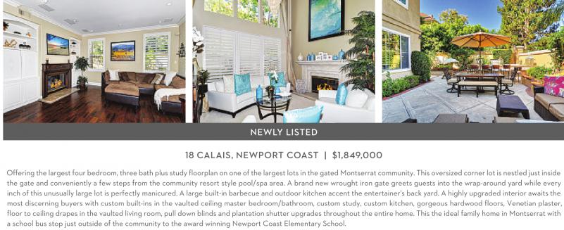 NEWLY LISTED 18 CALAIS, NEWPORT COAST | $1,849,000 Offering the largest four bedroom, three bath plus study floorplan on one of the largest lots in the gated Montserrat community. This oversized corner lot is nestled just inside the gate and conveniently a few steps from the community resort style pool/spa area. A brand new wrought iron gate greets guests into the wrap-around yard while every inch of this unusually large lot is perfectly manicured. A large built-in barbecue and outdoor kitchen accent the entertainer's back yard. A highly upgraded interior awaits the most discerning buyers with custom built-ins in the vaulted ceiling master bedroom/bathroom, custom study, custom kitchen, gorgeous hardwood floors, Venetian plaster, floor to ceiling drapes in the vaulted living room, pull down blinds and plantation shutter upgrades throughout the entire home. This the ideal family home in Montserrat with a school bus stop just outside of the community to the award winning Newport Coast Elementary School.