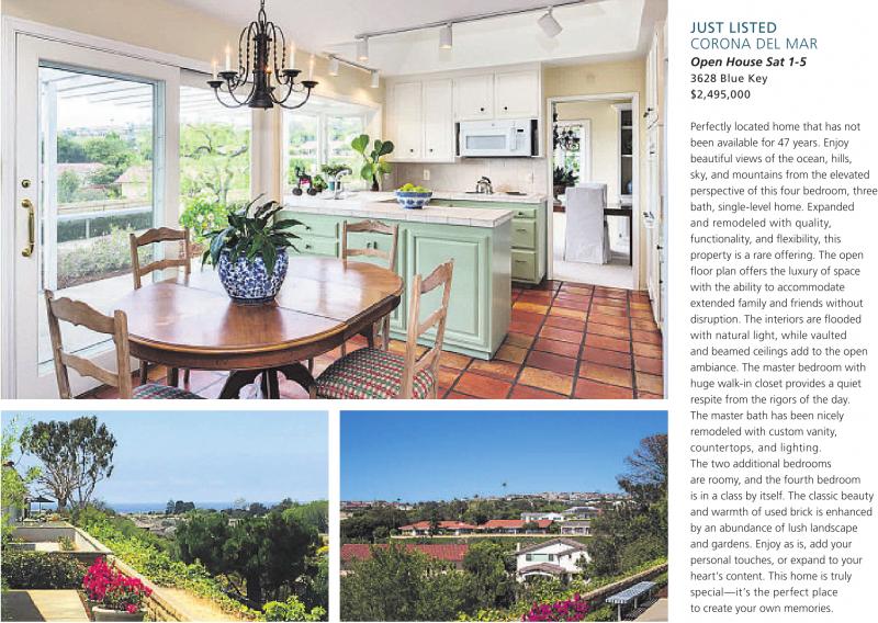 JUST LISTED CORONA DEL MAR Open House Sat 1-5 3628 Blue Key $2,495,000 Perfectly located home that has not been available for 47 years. Enjoy beautiful views of the ocean, hills, sky, and mountains from the elevated perspective of this four bedroom, three bath, single-level home. Expanded and remodeled with quality, functionality, and flexibility, this property is a rare offering. The open floor plan offers the luxury of space with the ability to accommodate extended family and friends without disruption. The interiors are flooded with natural light, while vaulted and beamed ceilings add to the open ambiance. The master bedroom with huge walk-in closet provides a quiet respite from the rigors of the day. The master bath has been nicely remodeled with custom vanity, countertops, and lighting. The two additional bedrooms are roomy, and the fourth bedroom is in a class by itself. The classic beauty and warmth of used brick is enhanced by an abundance of lush landscape and gardens. Enjoy as is, add your personal touches, or expand to your heart’s content. This home is truly special—it’s the perfect place to create your own memories.