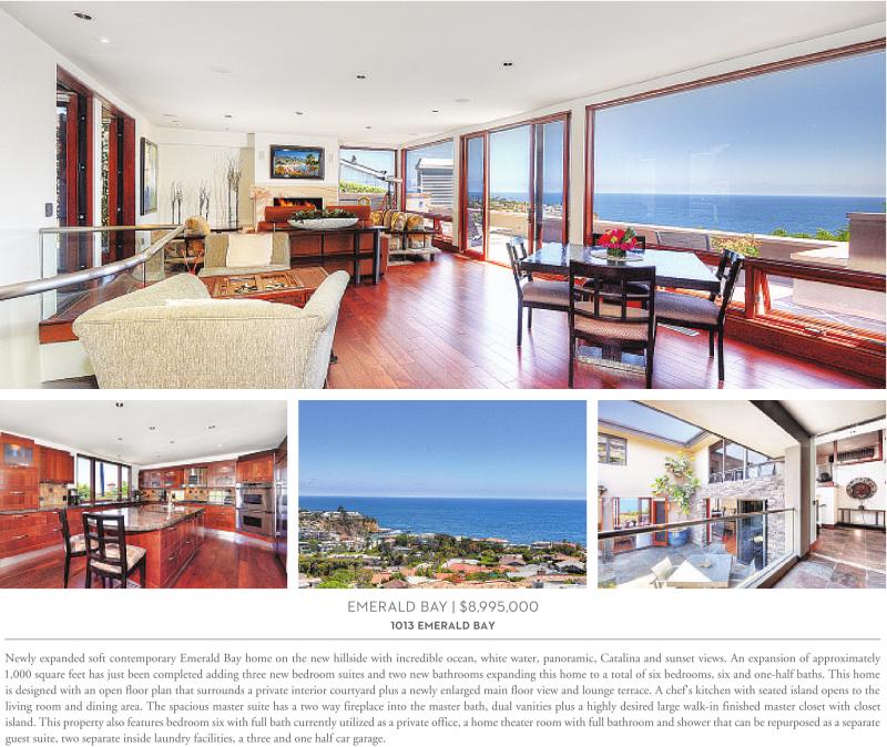 EMERALD BAY | $8,995,000 1013 emerald bay Newly expanded soft contemporary Emerald Bay home on the new hillside with incredible ocean, white water, panoramic, Catalina and sunset views. An expansion of approximately 1,000 square feet has just been completed adding three new bedroom suites and two new bathrooms expanding this home to a total of six bedrooms, six and one-half baths. This home is designed with an open floor plan that surrounds a private interior courtyard plus a newly enlarged main floor view and lounge terrace. A chef's kitchen with seated island opens to the living room and dining area. The spacious master suite has a two way fireplace into the master bath, dual vanities plus a highly desired large walk-in finished master closet with closet island. This property also features bedroom six with full bath currently utilized as a private office, a home theater room with full bathroom and shower that can be repurposed as a separate guest suite, two separate inside laundry facilities, a three and one half car garage.