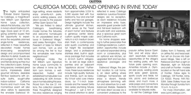 highly anticipated Model Grand Opening for Calistoga, a magnificent new William Lyon Signature Home luxury collection, debuts this Saturday, July 16th in Irvine’s vibrant Eastwood Village. Doors open at 10 am, giving potential buyers their first opportunity to experience the exquisitely planned single-family residences, reflected in three beautifully decorated model homes showcasing exceptional design and uncompromised attention to detail. Guests are encouraged to invite family and friends along as they tour the collection’s open, flowing living spaces, oversized great rooms, impressively styled gourmet kitchens, desirable first-floor bedrooms with ensuite baths, sought-after indoor-outdoor California Rooms and much more. The momentous event will also allow visitors to appreciate the enviable Eastwood Vil-