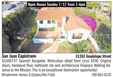 Open House Sunday7/17 from 1-4pm San Juan Capistrano 31352Guadalupe Street $1048747 Spanish Bungalow. Meticulous detail from circa 1930. Original doors, hardwood floor,bathroomtile andarchitectural fireplace. Walking distance to the Mission.This is an exceptional destination opportunity! Windermere Homes &Estates/Ken Follis 760-803-6235