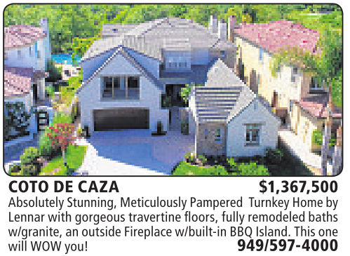 COTO DE CAZA $1,367,500 Absolutely Stunning, Meticulously Pampered Turnkey Home by Lennar with gorgeoustravertine floors,fully remodeledbaths w/granite, an outsideFireplace w/built-in BBQIsland.This one will WOW you! 949/597-4000