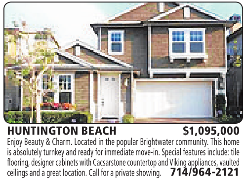 HUNTINGTON BEACH $1,095,000 Enjoy Beauty &Charm. Located in the popular Brightwater community. This home is absolutelyturnkey and readyfor immediatemove-in. Specialfeatures include: tile flooring,designercabinetswithCacsarstone countertopand Viking appliances, vaulted ceilings andagreat location. Call for aprivate showing. 714/964-2121