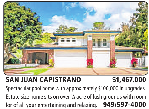 SAN JUAN CAPISTRANO $1,467,000 Spectacular poolhomewithapproximately $100,000 in upgrades. Estate size home sits on over½acreoflushgroundswithroom forofall your entertainingand relaxing. 949/597-4000