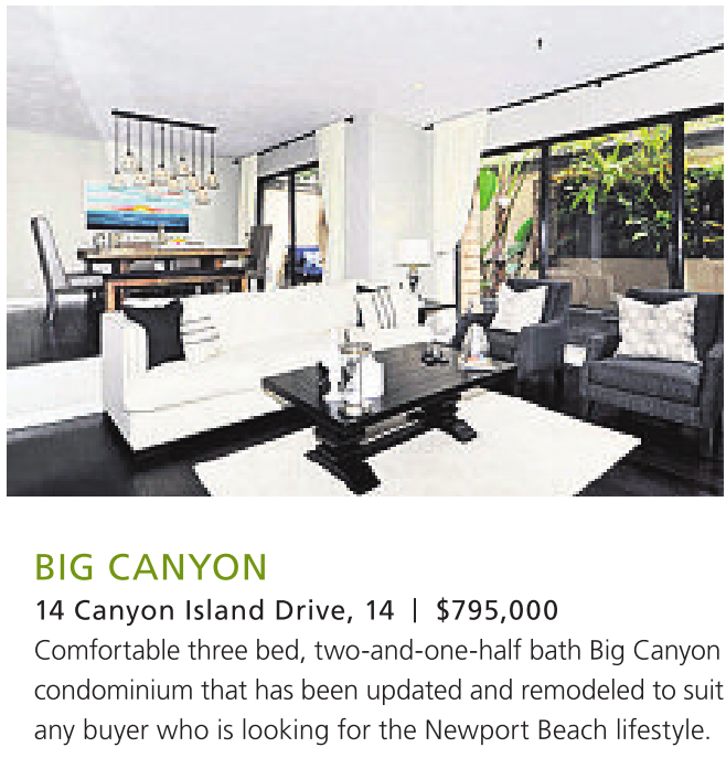 14 Canyon Island Drive, 14 | $795,000 Comfortable three bed, two-and-one-half bath Big Canyon condominium that has been updated and remodeled to suit any buyer who is looking for the Newport Beach lifestyle.
