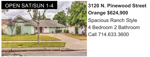 3120 N. Pinewood Street Orange $624,900 Spacious Ranch Style 4 Bedroom 2 Bathroom Call 714.633.3600