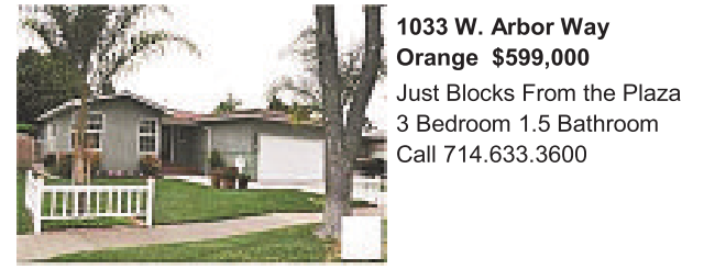 1033 W. Arbor Way Orange $599,000 Just Blocks From the Plaza 3 Bedroom 1.5 Bathroom Call 714.633.3600