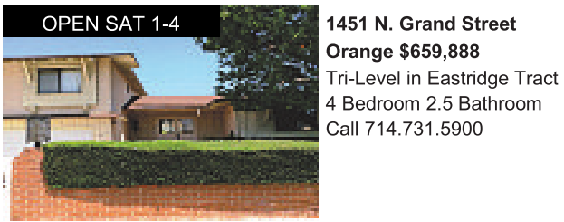 1451 N. Grand Street Orange $659,888 Tri-Level in Eastridge Tract 4 Bedroom 2.5 Bathroom Call 714.731.5900
